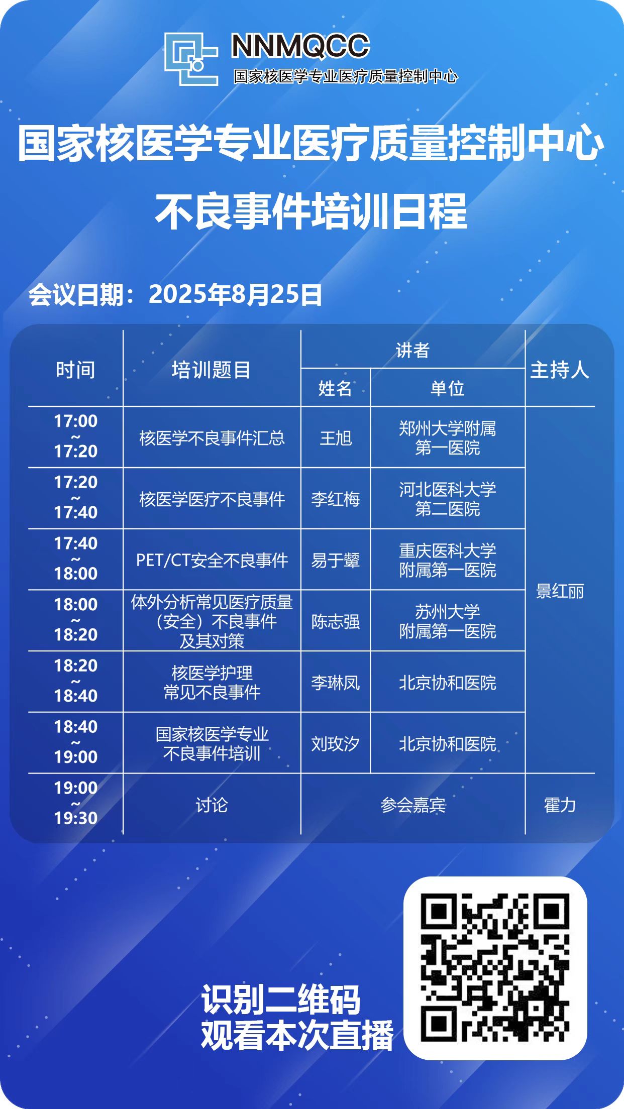 2025年8月25日17:00-19:30召开国家核医学质控中心月调度会第八次会议,会议主题为核医学专业不良事件培训。会议邀请了6位老师从医技护方面分别分享工作中的核医学不良事件相关工作,本次会议采取直播形式,各医疗机构可扫描下方二维码参会。会议日程如下: