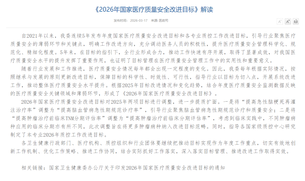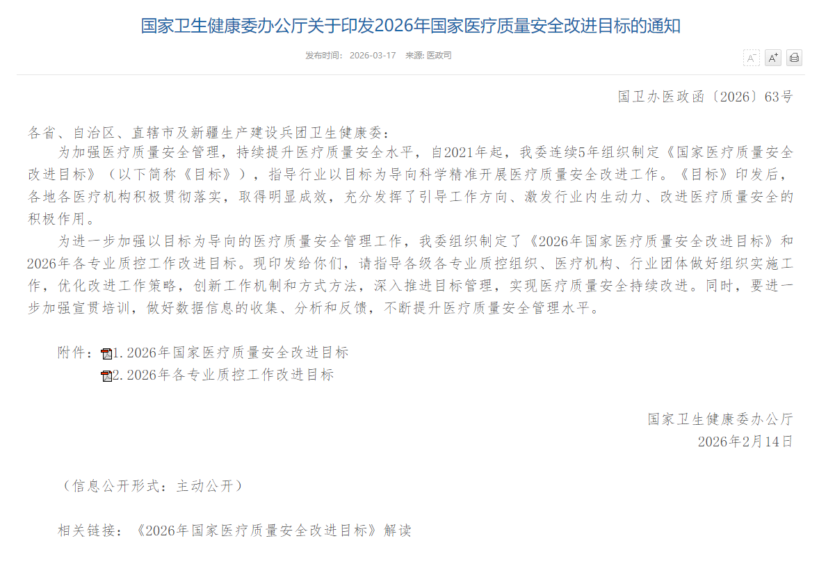 国家卫生健康委办公厅关于印发2026年国家医疗质量安全改进目标的通知