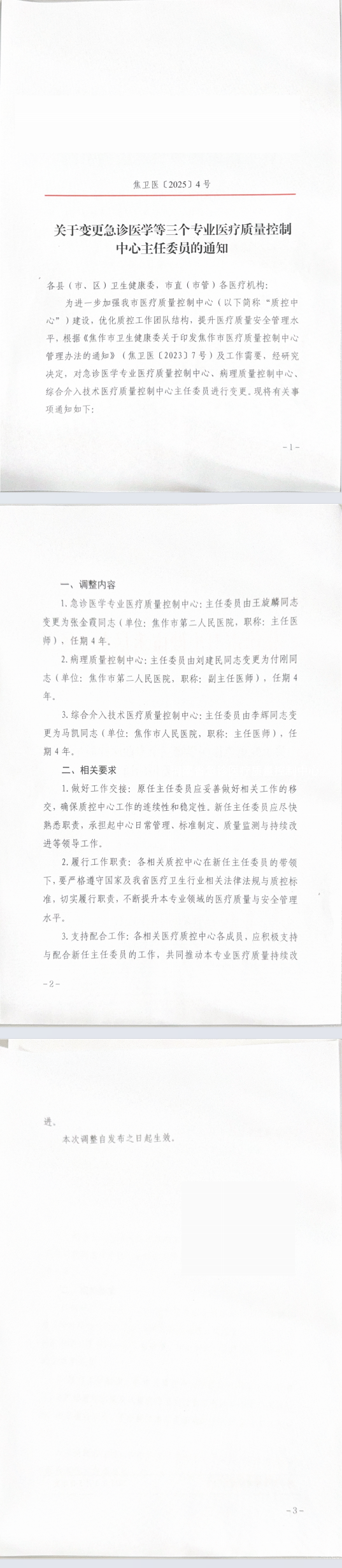 焦卫医【2025】4号关于变更急诊医学等三个专业医疗质量控制中心主任委员的通知