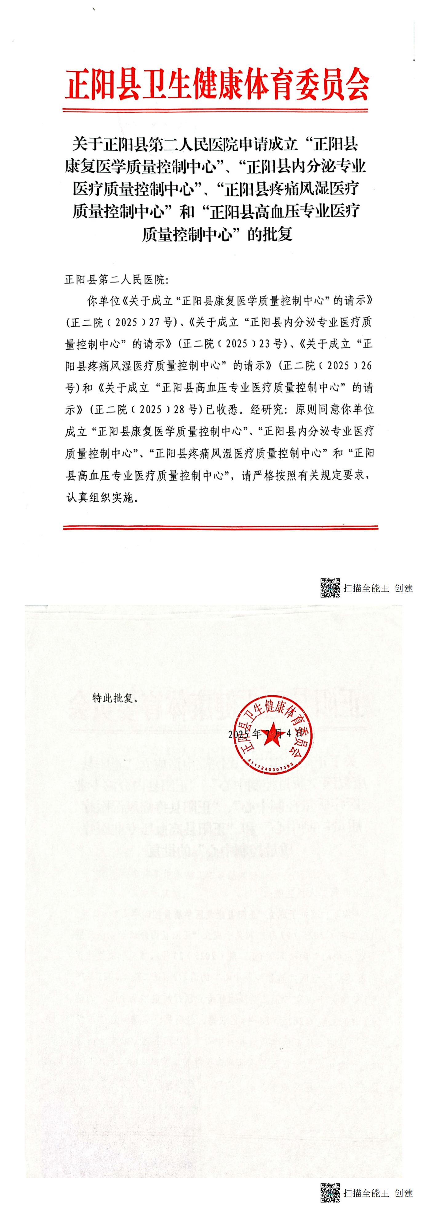 | 【织网行动县级】关于正阳县第二人民医院申请成立“正阳县康复医学质量控制中心”、“正阳县内分泌专业医疗质量控制中心”、“正阳县疼痛风湿医疗质量控制中心”和“正阳县高血压专业医疗质量控制中心”的批复 |