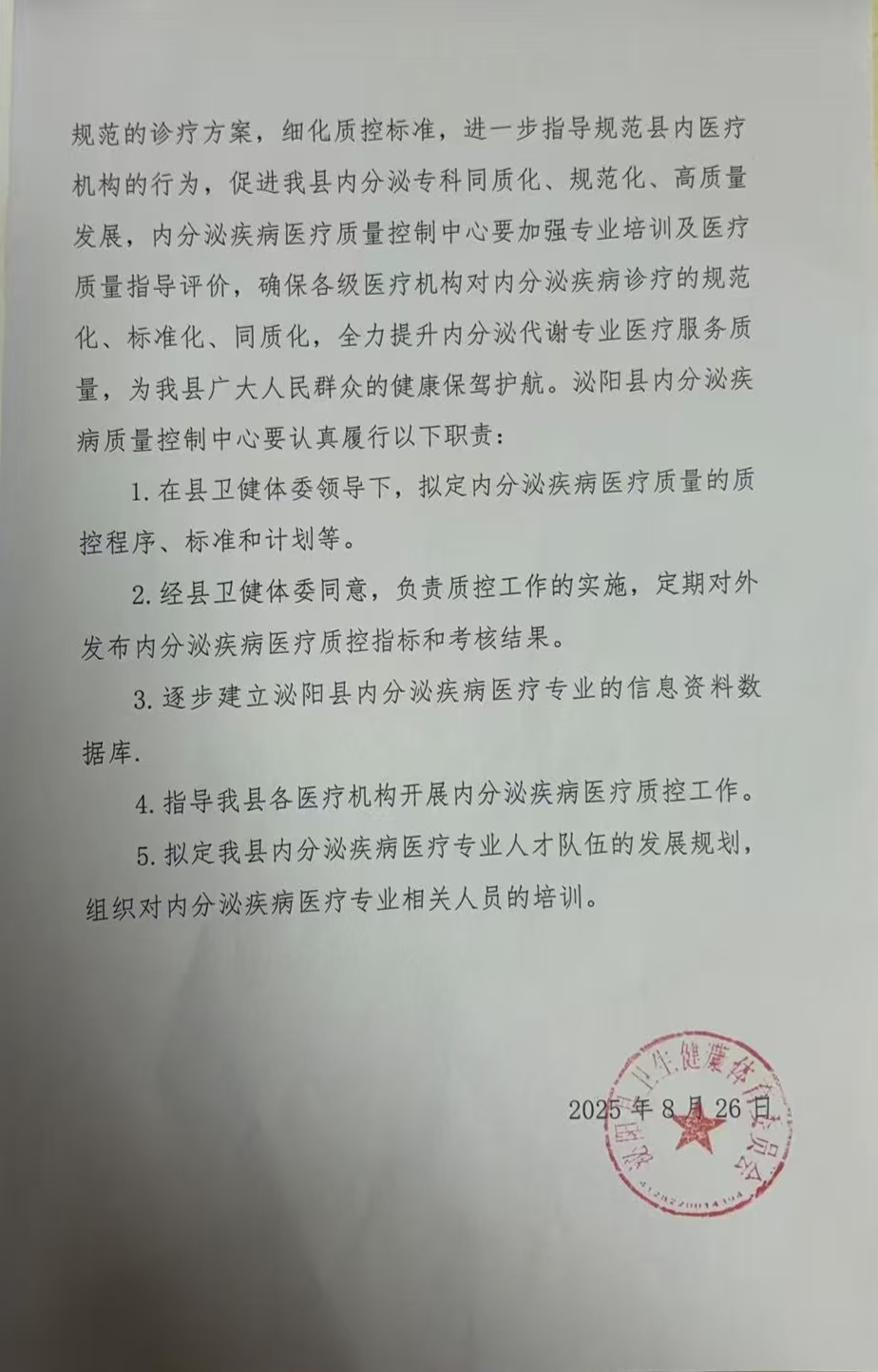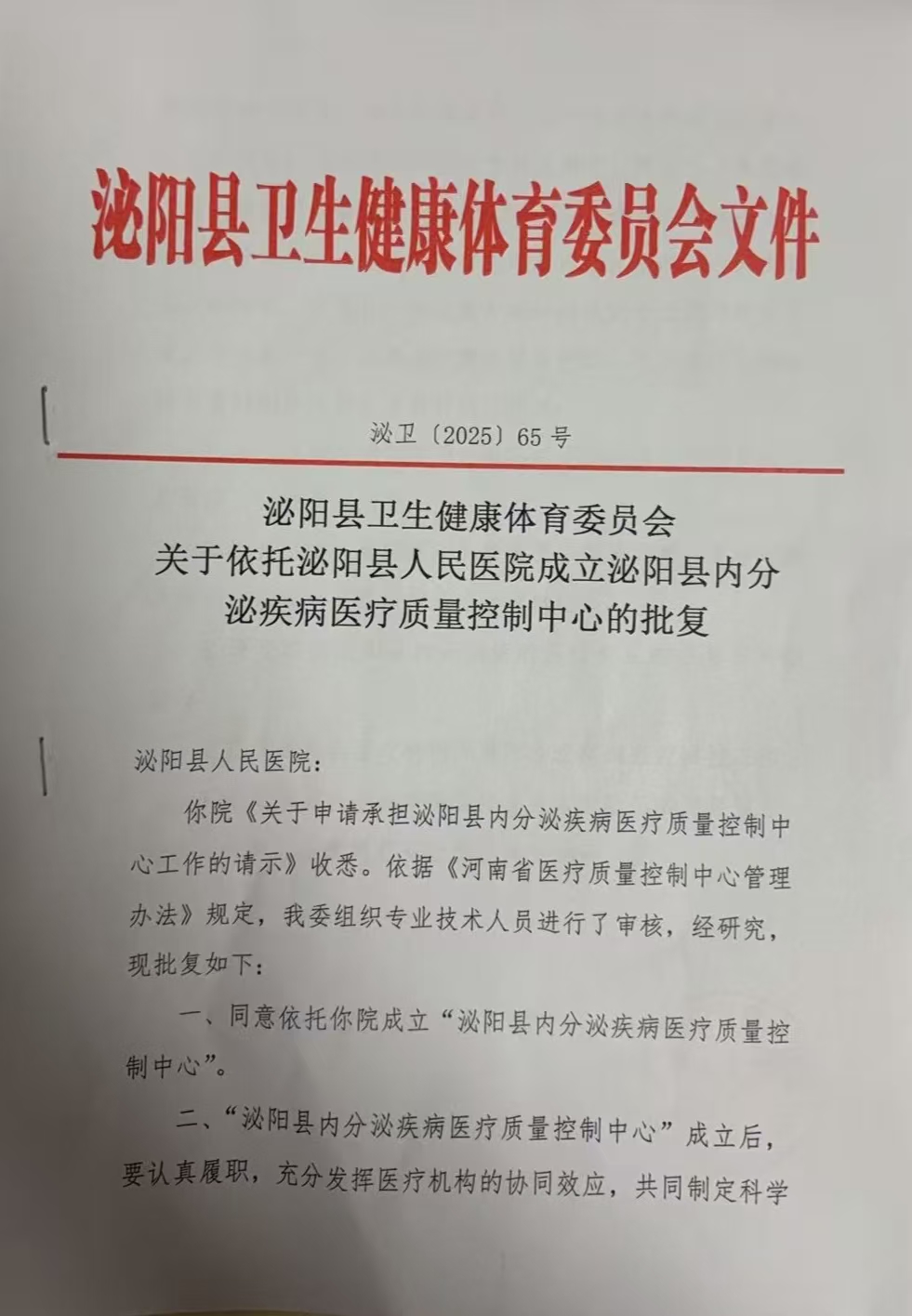| 【织网行动县级】泌阳县卫生健康体育委员会关于依托泌阳县人民医院成立泌阳县内分泌疾病医疗质量控制中心的批复 |