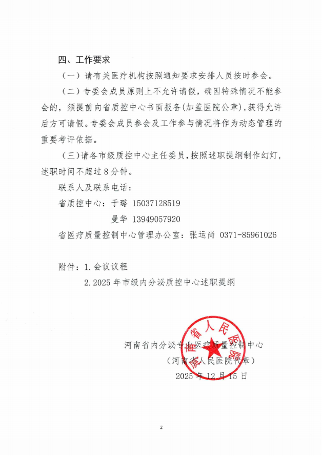 河南省内分泌专业医疗质量控制中心关于组织开展2025年市级医疗质量控制中心述职工作的通知