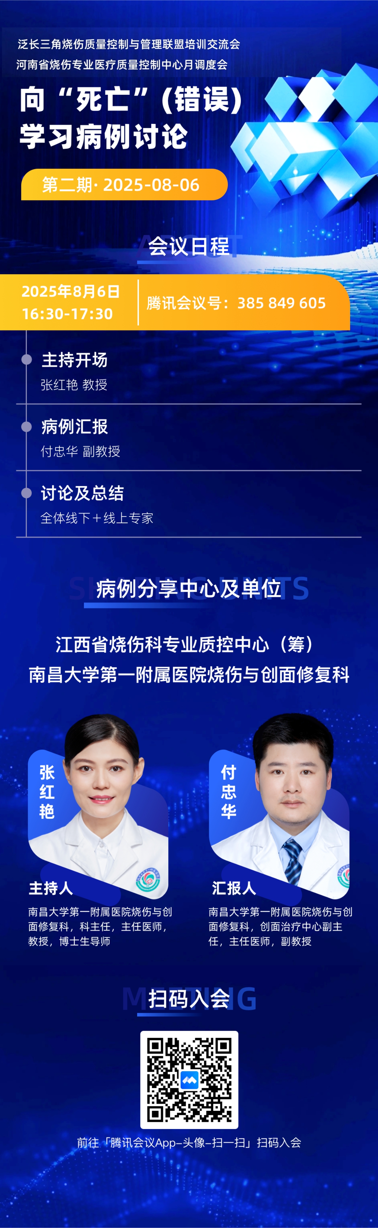 分享中心:江西省烧伤科专业质控中心 病例提供单位:南昌大学第一附属医院烧伤与创面修复科 这是一场关于特重度烧伤病例治疗的学术讨论会。会议围绕一例90%体表烧伤患者的救治过程展开,重点讨论了感染控制、创面处理和植皮技术等临床难题。多位烧伤领域专家分享了各自的经验和治疗策略。
