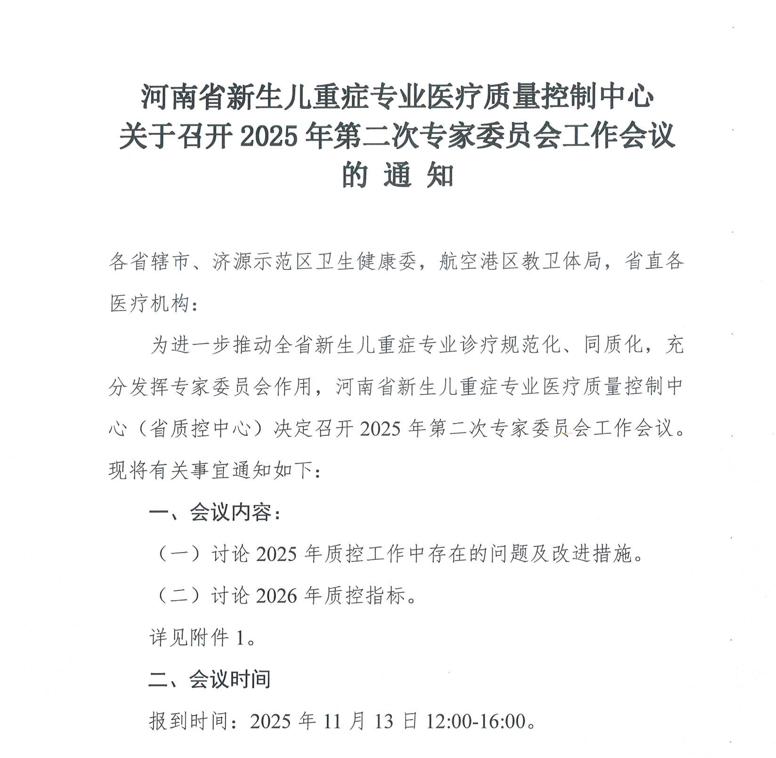 河南省新生儿重症专业医疗质量控制中心关于召开2025年第二次专家委员会工作会议的通知