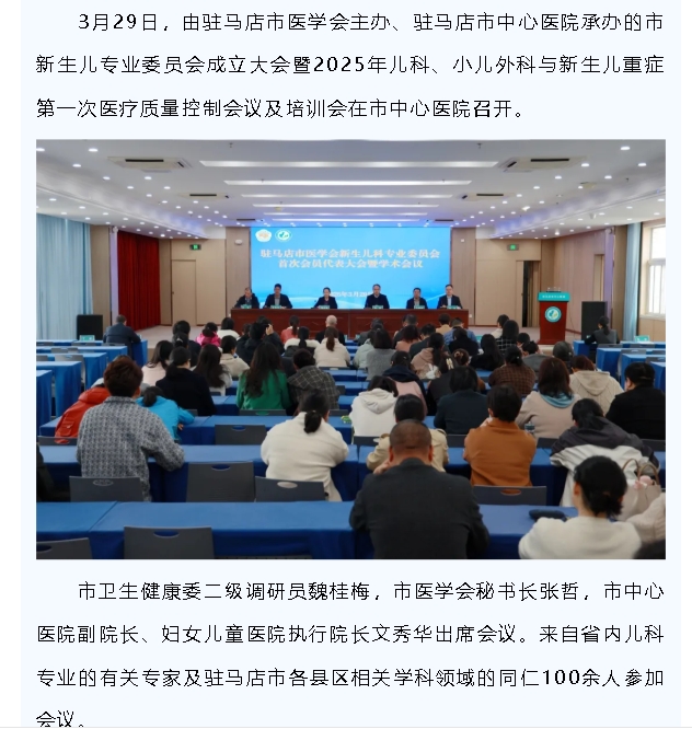 | 驻马店市新生儿专业委员会成立大会暨2025年儿科、小儿外科与新生儿重症第一次医疗质量控制会议及培训会召开 |