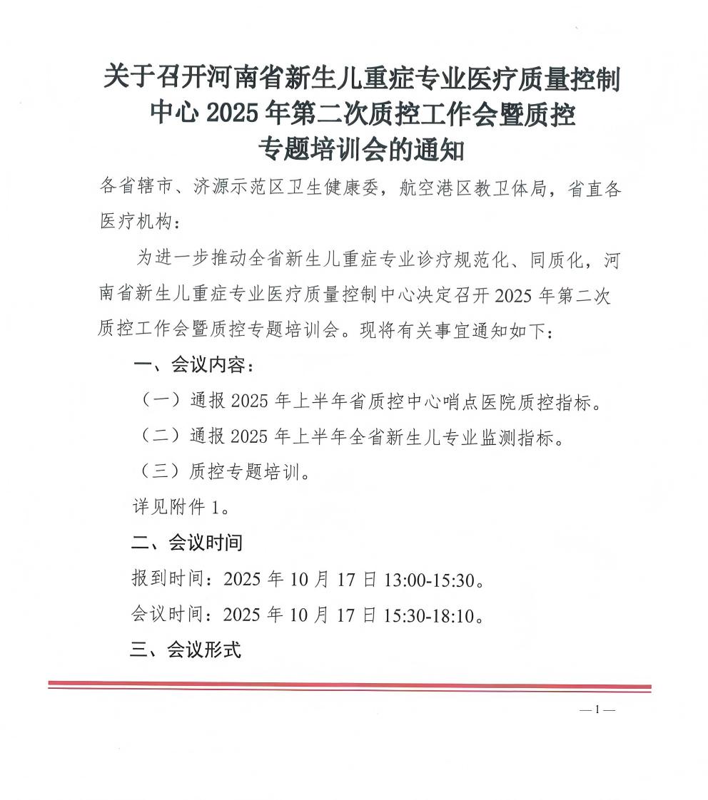 | 关于召开河南省新生儿重症专业医疗质量控制 中心2025年第二次质控工作会暨质控 专题培训会的通知 |