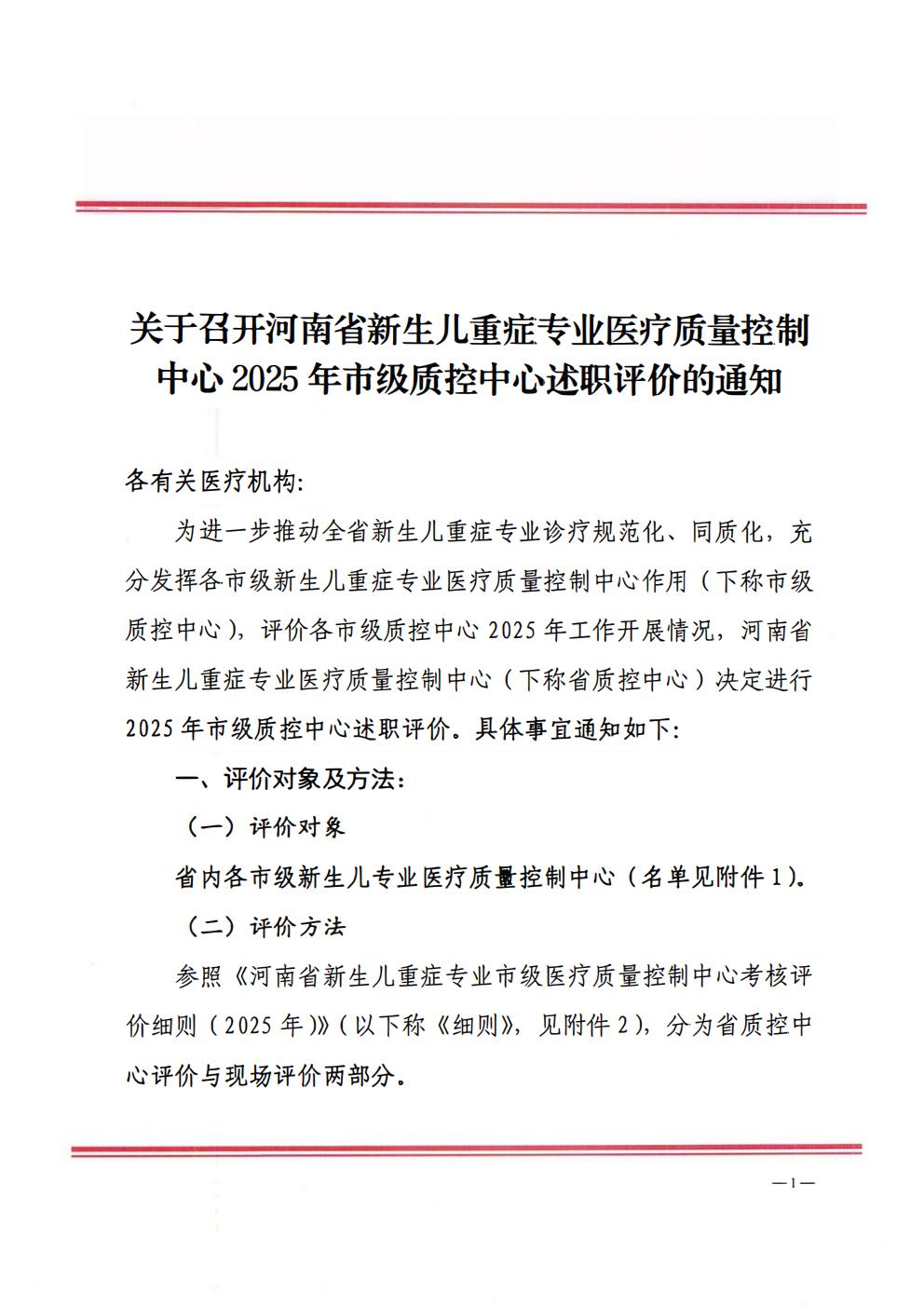 关于召开河南省新生儿重症专业医疗质量控制中心2025年市级质控中心述职评价的通知