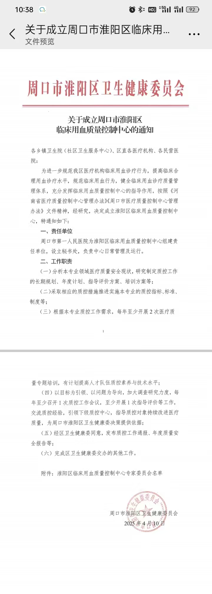 | 周口市下辖各区县均已成立临床用血医疗质量控制中心 |